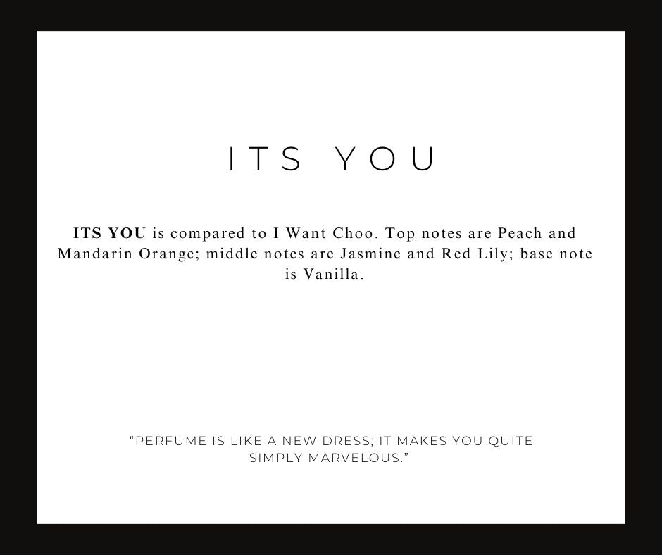 ITS YOU   is an Peach and Mandarin Orange; middle notes are Jasmine and Red Lily; base note is Vanilla.